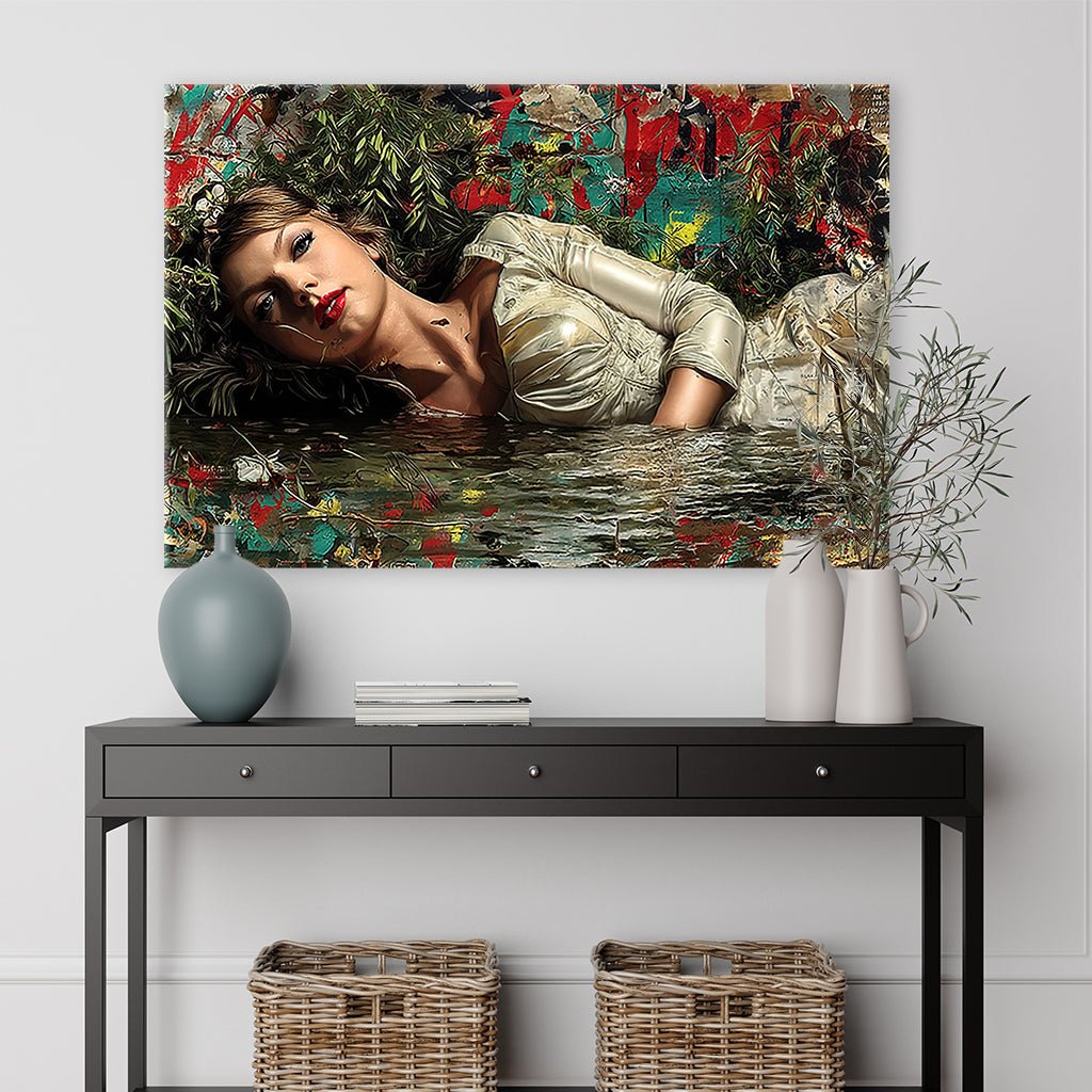 Diese moderne „Ophelia“-Darstellung zeigt Taylor Swift in einem glänzenden Satinkleid, die fotorealistisch in flachem Wasser liegt. Die Szenerie wird durch eine verwitterte Wand mit urbanen Farbflecken und dunklem Blattwerk ergänzt, was der klassischen Komposition einen zeitgenössischen Charakter verleiht. Durch die Verschmelzung von feinen Lichtreflexen und groben, malerischen Pinselstrichen entsteht ein kraftvolles Mixed-Media-Werk.