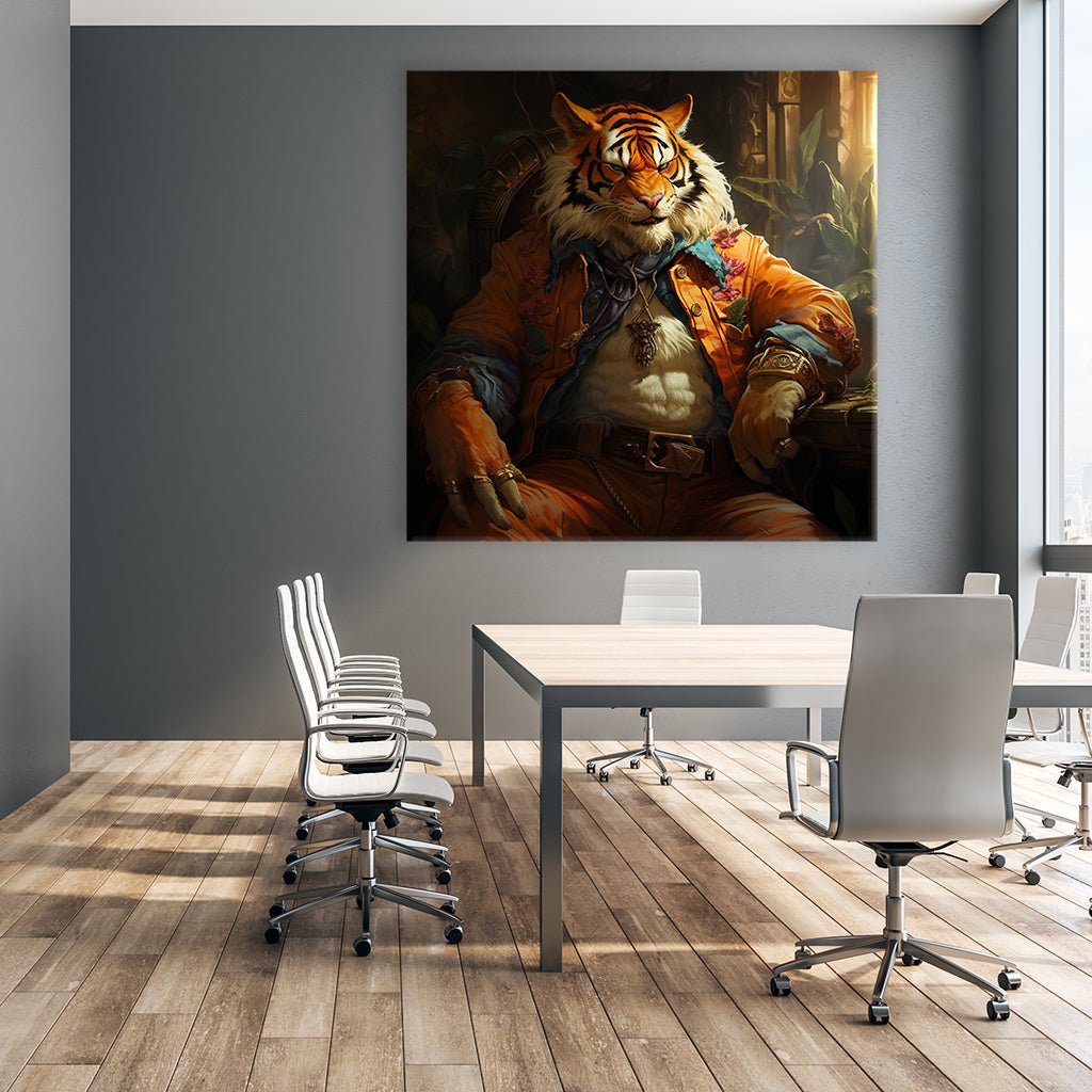 Ein gewaltiger Tiger, stolz und wild, thront auf einem massiven Stuhl, gehüllt in ein Piratenoutfit und goldenen Ringen an seinen Fingern. Sein Blick ist finster, eine Aura von Macht und Entschlossenheit umgibt ihn. Als Pirat der Meere beherrscht er das Reich der Wellen und setzt sein Reich durchdringend in Szene.