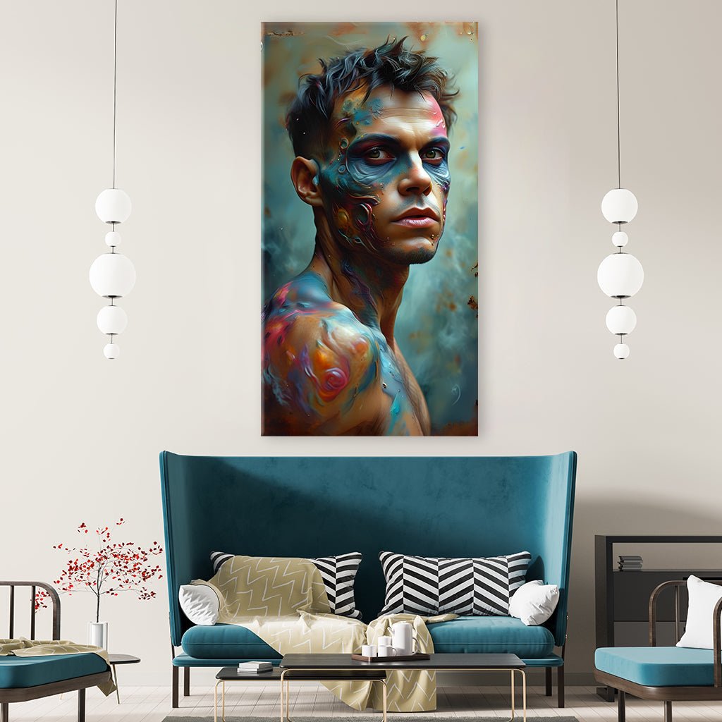 Das Bild zeigt ein Porträt eines Mannes dessen Gesicht und Schultern sind bunten Farben bemalt sind, die an Kriegsbemalung oder Stammesmuster erinnern. Die Farben sind lebendig und kontrastreich, mit Blau-, Rot-, Orange- und Gelbtönen. Der Mann hat einen ernsten, fast melancholischen Gesichtsausdruck und blickt zur Seite. Der Hintergrund ist unscharf und hat eine unbestimmte Textur, die an eine alte Wand erinnert.