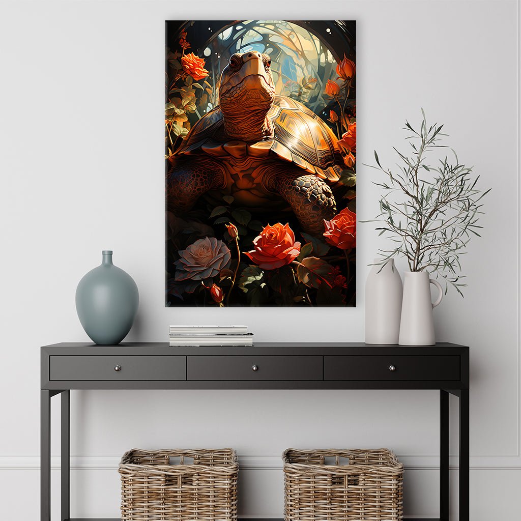 Eine Landschildkröte in Nahaufnahme bahnt sich ihren Weg durch ein Meer aus zarten Rosenblüten. Im Hintergrund zeichnen sich Baumkronen ab. Diese Szenerie vereint die ruhige Entschlossenheit der Schildkröte mit der Anmut der Blumen und der majestätischen Kulisse der Berge. Ein Bild, das die Natur in all ihrer Vielfalt und Schönheit einfängt.
