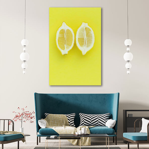 Das Motiv zeigt eine aufgeschnittene Zitrone, platziert auf einem leuchtend gelben Hintergrund. Die Zitrone ist in der Mitte aufgeschnitten, sodass ihr saftiges Inneres sichtbar wird. Der gelbe Hintergrund erzeugt eine lebendige Atmosphäre und lässt die Farbe der Zitrone besonders strahlen. Das leuchtende Gelb bringt Freude und Energie in den Raum und verleiht dem Motiv eine fröhliche Note.
